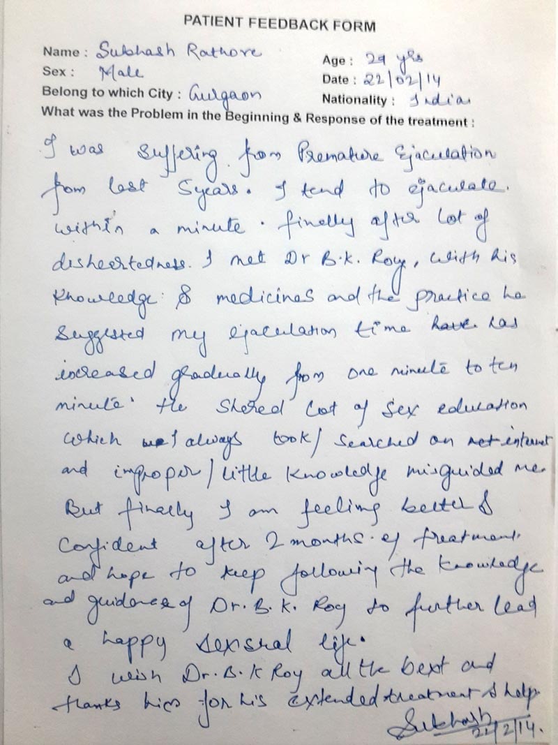 For consultation & treatment (at our centre / or online) click How to Consult Us (Last Updated on: ) Premature Ejaculation (PME) Please watch Dr. B.K.Roy videos on this topic by clicking below youtube links or read detail description given below