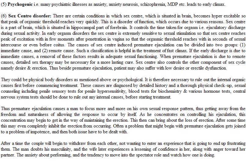 Premature ejaculation (also known as early discharge or quick orgasm, early fall, Shigra-patan) is one of the most frequent, of sexual disorders in the male and is characterized by sudden ejaculation of the semen, just prior to or immediately after vaginal penetration during intercourse (before one wishes or before he could satisfy the female partner). Approximately 10% to 30% people of all age group suffer with quick semen discharge. Premature or 'before time' in other words, is a condition where the man has no voluntary control over his ejaculation. He is quick on the trigger once he starts the coitus. This is a very frustrating disorders of male sexual function in which man feels totally helpless. This leads to bitterness in husbands & wife relationships. For the man, lack of control of his body functioning leaves him feeling unsure of himself. His pleasure is often decreased by the abrupt early discharge. Eventually his preoccupation with trying to postpone ejaculation will hinder his ability enjoy himself to sexual pleasure. When a man is, feeling inadequate, and ejaculating fast, the woman will probably be left unsatisfied. Her frustration will only increase the negative pattern. This is an easily treatable condition. Causes of Premature Ejaculation: